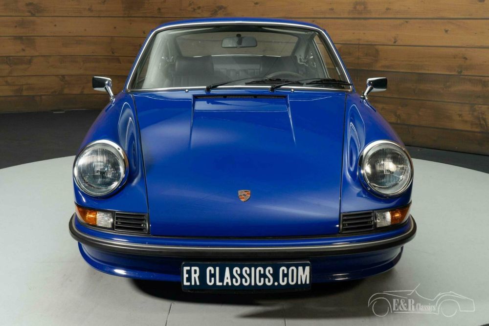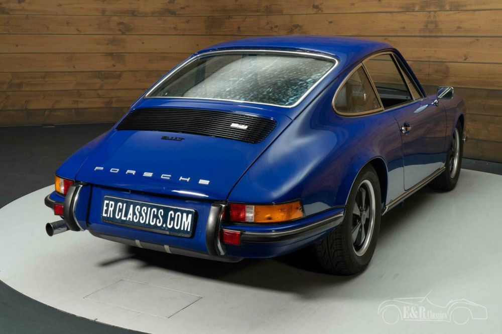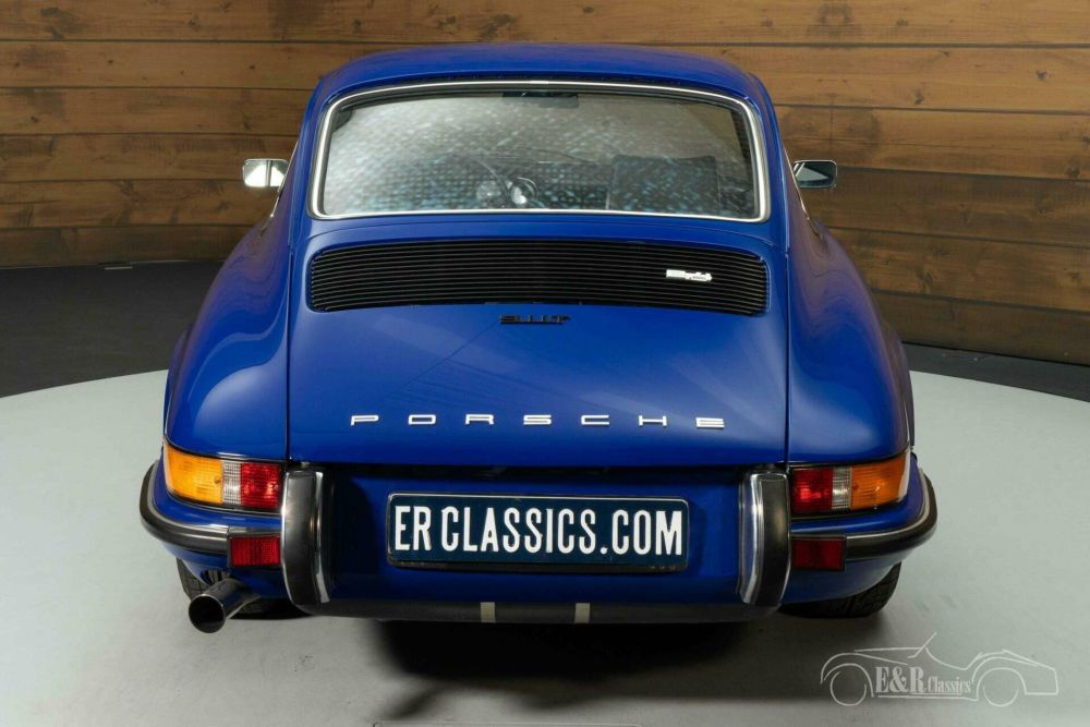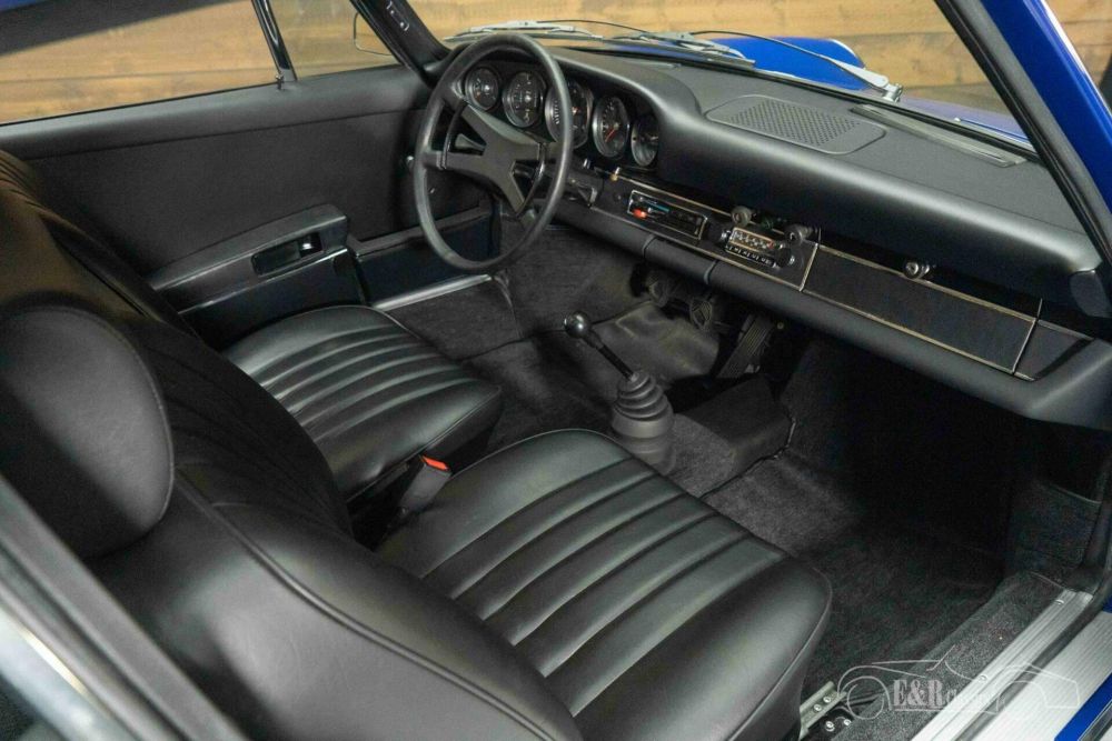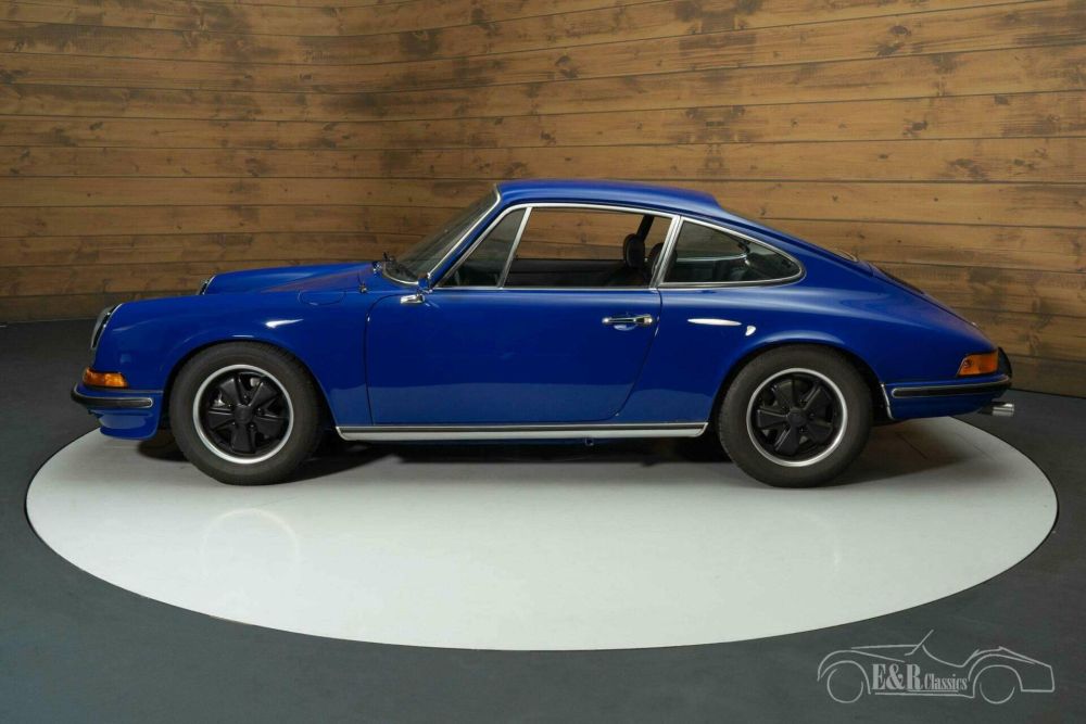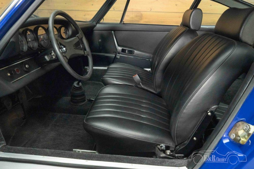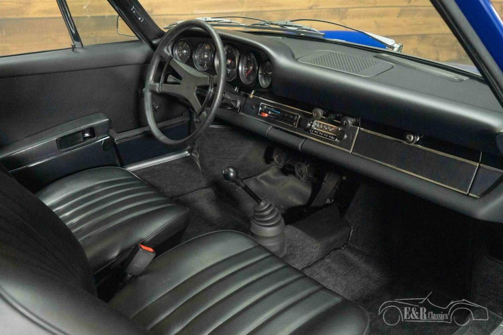 The bodywork is finished in a striking blue paint that contrasts beautifully with the sleek black leather interior. The original Fuchs rims complete the timeless silhouette and emphasize the sporty elegance of this model. Inside, the interior exudes the same class, with beautifully restored upholstery, a classic dashboard and original details that harmonize perfectly with the exterior. This Porsche 911T combines aesthetics, craftsmanship and history for a unique driving experience.