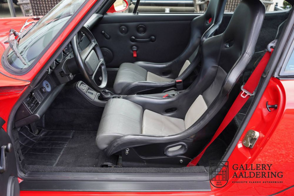 The otherwise original condition makes the RS an absolute eye-catcher. The red paintwork is the original color and is in beautiful condition. The 964 looks really great. All the sheet metal is in amazing condition, from far or close what a beautiful car! The interior is in a completely matching condition, the great non-adjustable bucket seats have a color scheme that is reminiscent of the seats of the legendary Porsche 959. The car radiates from all sides that the 98,698 kilometers driven have been made with care and love.