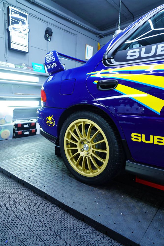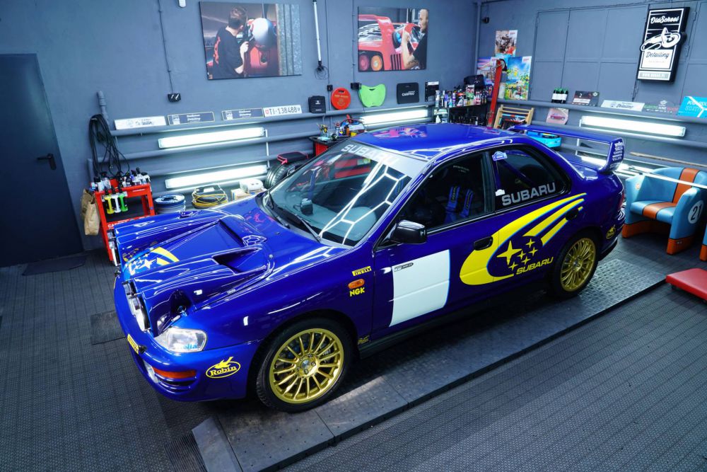 This car was bought new in 1996 by a belgian racing draver, Baudouin Lempereur. The sales agreement he signed with Subaru Vilvoorde stipulated that the Subaru was to remain on display in the dealer's showroom until March 1997, and in return the dealer would supply Lempereur with a set of the '555' stickers (the cigarette brand which sponsored the marque) used on the works cars. This car is, moreover, finished in the same attractive dark blue (555) as them.