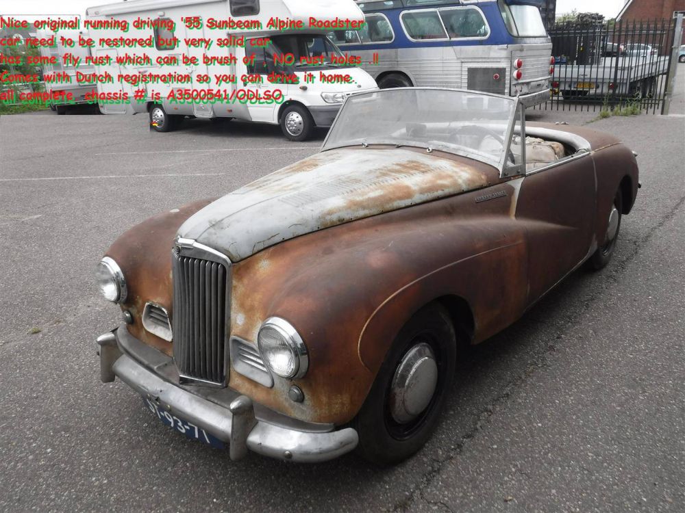 Nice original running / driving ''55 Sunbeam Alpine Roadster which need to be restored.But is a very solid car: has some fly rust which can be brushed off but NO rust holes. Comes with Dutch registration. Biggest choice in REAL Classic Cars in the Stolze Collection with more than 450 cars in stock ! From a project to perfect .