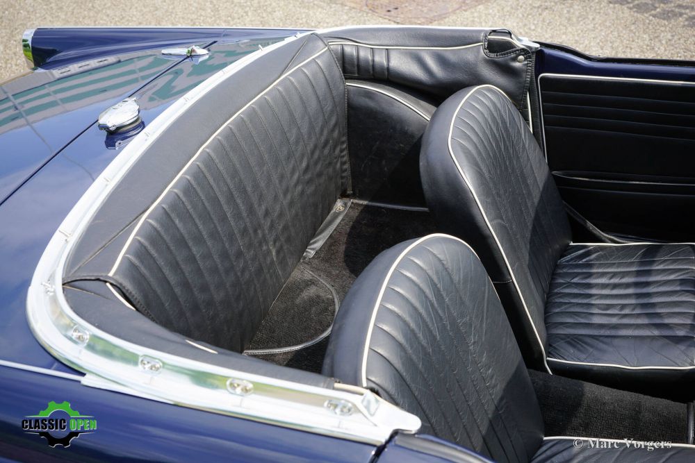 Colour dark blue combined with a black leather interior trimmed with white piping and black carpet. Black vinyl soft top.