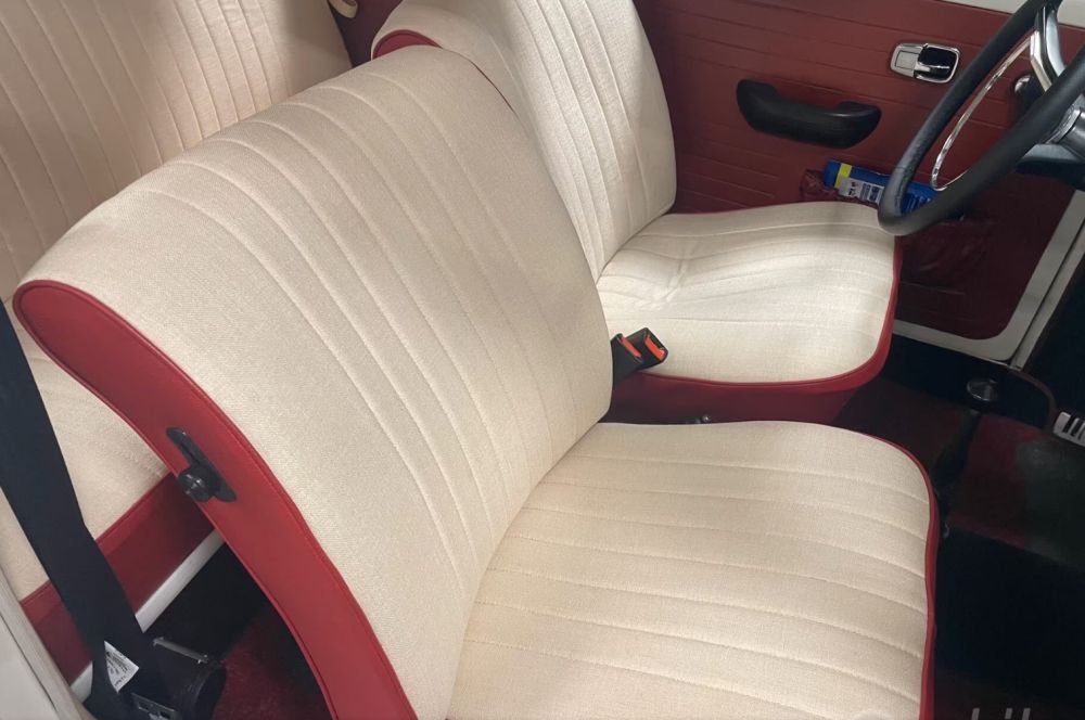 Vernice bicolor bianco/beige. Interni nuovi in vinile rosso e tessuto beige.