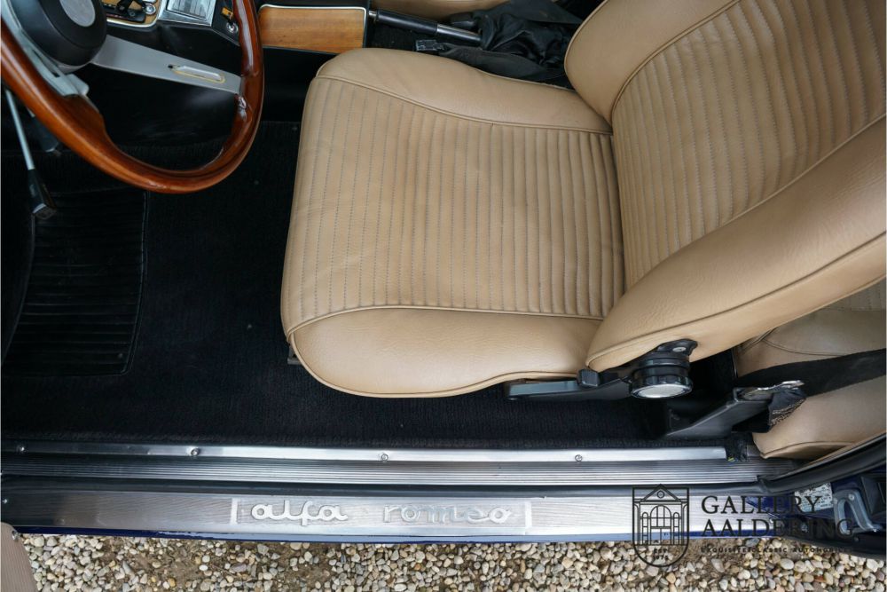 “Blu Ollandese” is most probably the prettiest colour for a 105 series Alfa Romeo, especially when it also has that delicious 2000 engine with twin Weber Carburettors. This car was first allowed on the road in America in 1974. The car has been fully restored to the highest standard. The unblemished bodywork looks fantastic. The nice and thin panelwork is correctly aligned The perfectly applied “Blu Ollandese” paintwork is simply brilliant. The brightwork too is in very good condition. It has perfectly complimentary black carpet and tan vinyl upholstery. During its restoration the 2000 GTV was re-upholstered and has remained pristine. The customary wooden steering wheel and long gearstick are also present. Ergonomically speaking this Alfa Romeo is unusually un-Italian in that it is good. You immediately find the right driving position when you sit down. It is therefore no surprise the 2000 GTV has remained a firm favourite classic. It delivers great entertainment when being driven sportively as well being perfectly able to transport you in all comfort over longer distances. The neat condition of the dashboard deserves a mention, with all gauges, controls and switches working as they should. The 2.0 litre 4-cylinder engine with double overhead cams delivers 132 Ps at 5,500 revs attached to its manual 5-speed gearbox. The engine has no trouble at all propelling this 1,028 kg light Italian coupé. This car sporting its iconic turbine rims is ready to go. It comes with a copy of the original Alfa Romeo owners manual.