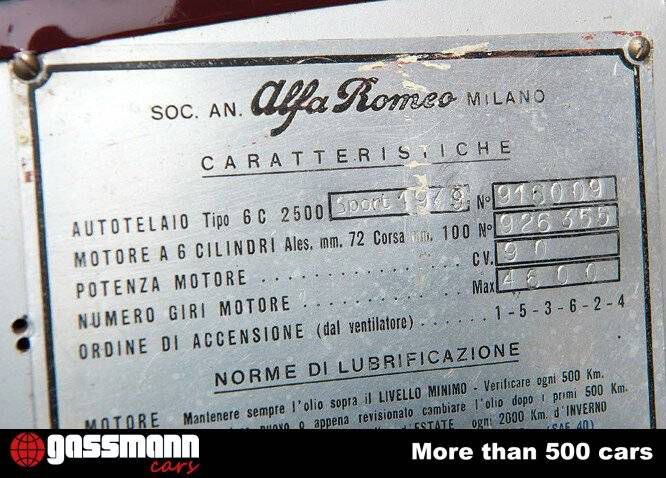 The 6C 2500 S on offer here was delivered new in Spain, having been ordered on 28 October 1947 and delivered on 9 March 1948, through Alfa Romeo importer Ruiz Jimenez. It was sold to a Mr Dioniso, then head of the Madrid Stock Exchange agents, who gifted it to his mistress, Ms Emilia Sierra. The car retains an interesting additional data plate issued in Spain, which details its delivery to Ms Sierra. The car remained in its original ownership until 1987, when it was acquired by its second owner, who had the car restored and kept it well maintained before passing it to another owner.