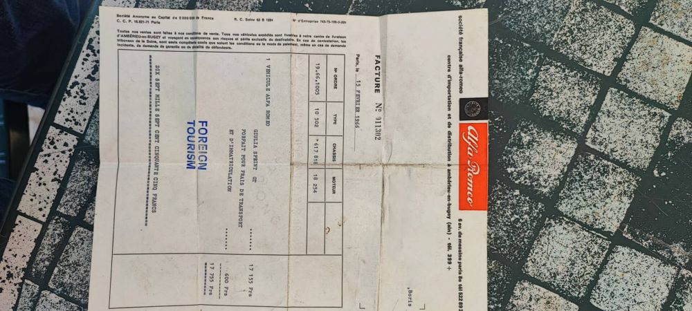 This Alfa Romeo Giulia 1600 Sprint GT is a 2 owner car since new. She was purchased at Alfa Romeo in Paris on the 15th of February 1966. We know this as the original invoice is still present with the car! That is something that you rarely come across. She was later purchased by her second owner back in Paris who has had her up until now.