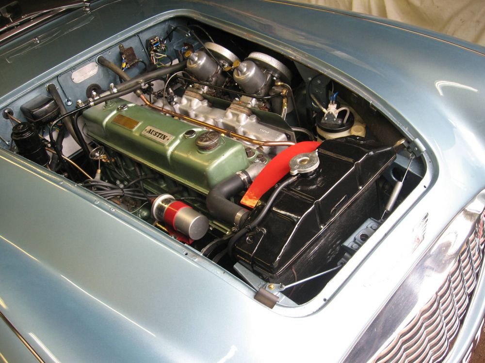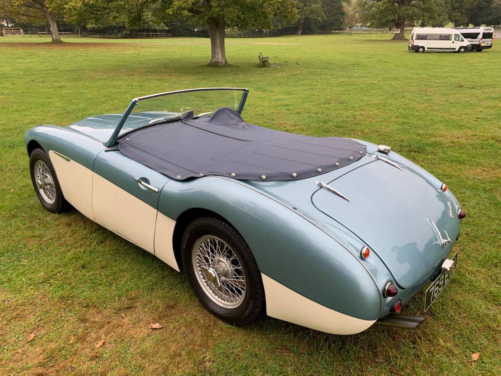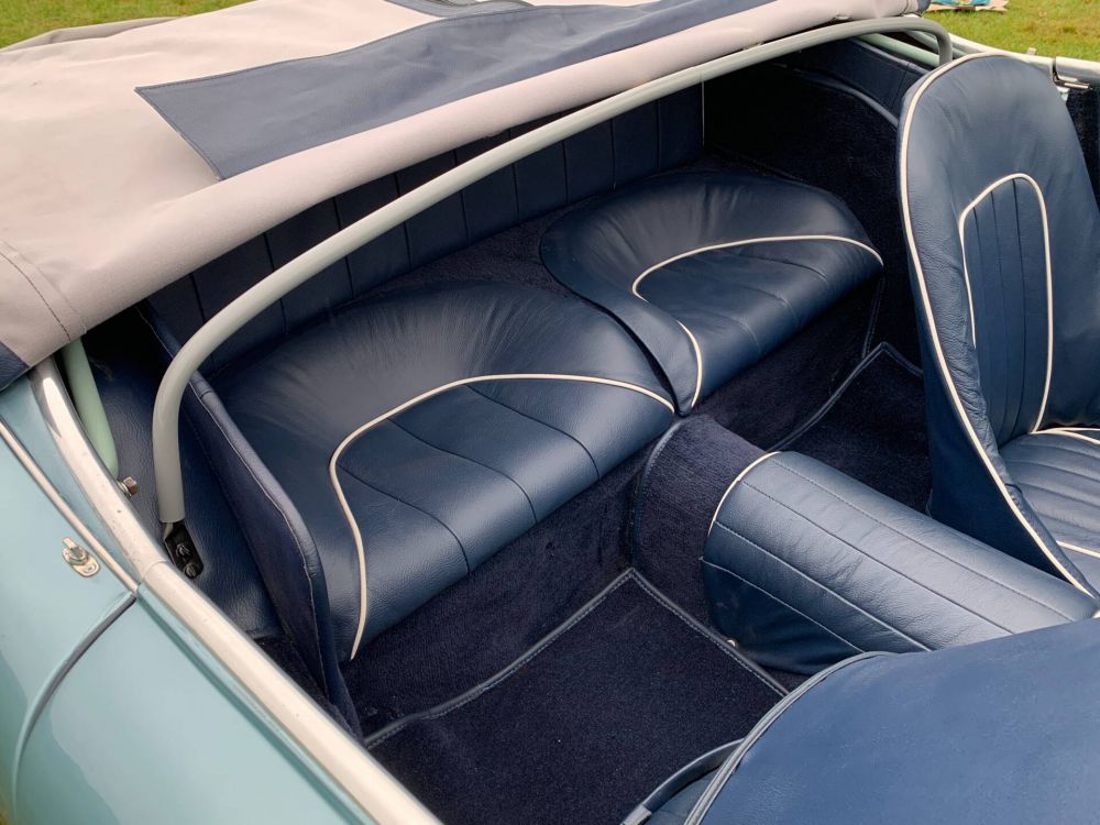 Austin Healey 100/6 BN4 1958, original colour of Healey Blue and Ivory white with blue leather interior and blue hood. This is a very interesting UK supplied home market car with matching numbers. When it was built on the 14th March 1958 it went to the Austin Exhibition Hall where we believe it was prepared as a rally car and painted Healey rally red. Dunlop disc brakes were fitted front and back which in those days were usually supplied for C and D type Jaguars. When the second owner purchased the car in 1969 the car was still red and also had all the rally instrumentation still in the car and fixed seats and harnesses. This is also a rare Longbridge built Healey with the bead down the centre of the bonnet, which were fitted to all the works cars as well. The car was sold to a David Smith in the mid seventies who is a great friend of the current keeper who purchased from him a few years ago. The car has since been put back to original spec including a full repaint in the original colours and an interior re-trim with new soft top, tonneau cover and side screens. There is a lovely history file including owners manual, Heritage certificate and original buff log book. Lovely condition inside and out. £44,995 any inspection welcome and delivery available.