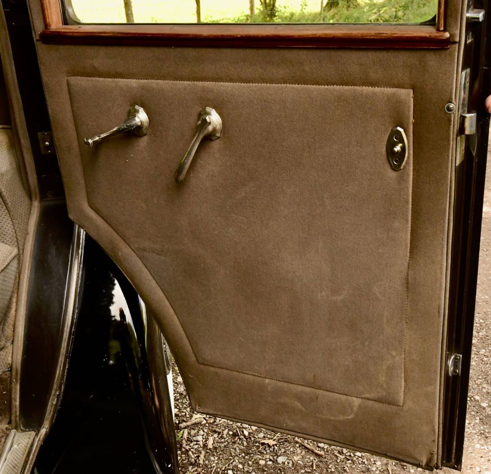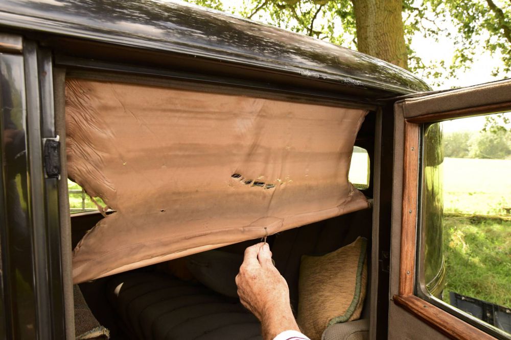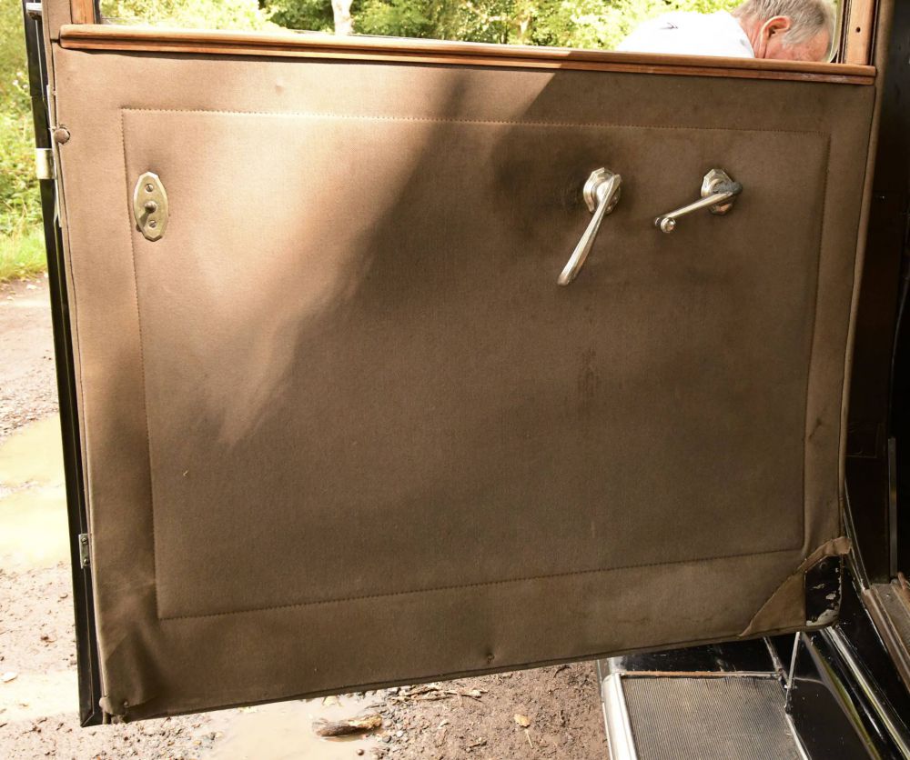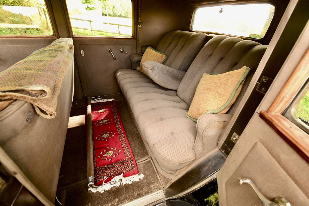 The interior was trimmed in cloth, the car retaining its original seat coverings, silk blinds, head lining and even its original carpets. The back of the driver's seat has had a rudimentary repair and is covered by a temporary cloth - otherwise the interior is in remarkable condition.