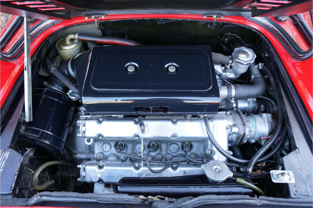 The interior, executed in black with red carpets, is in simply eye-catching good condition. The beautifully shaped seats are adorned with lovely black leather, and the dashboard, together with the magnificent gaug-es, has also been wonderfully preserved.