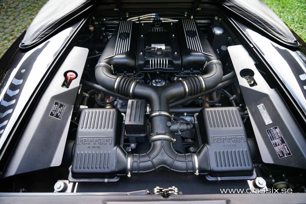 Interior: The interior of this Ferrari F355 Spider is finished in black leather, complementing the exterior to complete the sought-after “triple black” specification – black exterior, black interior, and black soft top. The interior is in excellent condition. The leather upholstery and seats are undamaged and feel soft and supple. The common issue of sticky buttons on Italian cars from this era has been fully resolved. The seats are comfortable, and with an adjustable steering wheel, the cabin accommodates individuals of various sizes. The front trunk provides ample space for your necessary belongings.