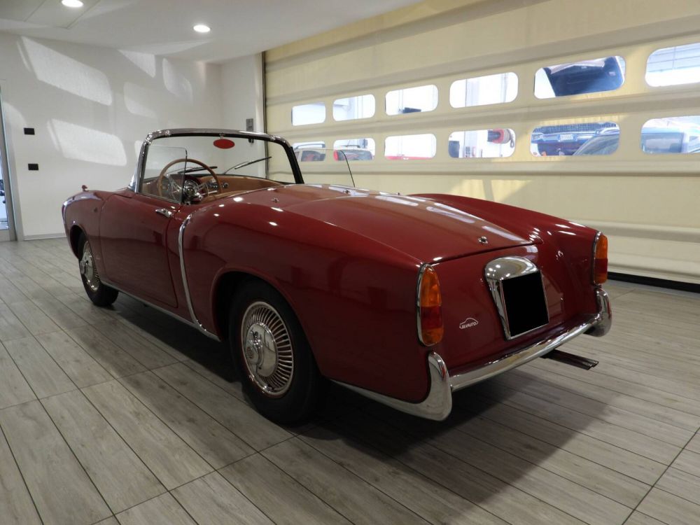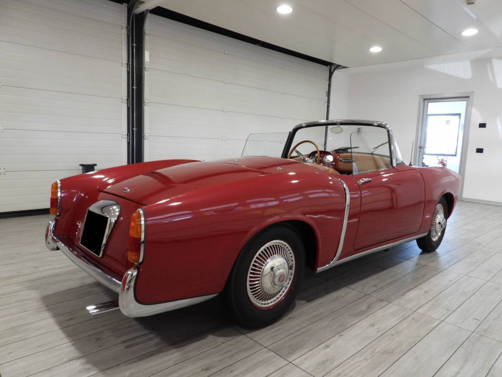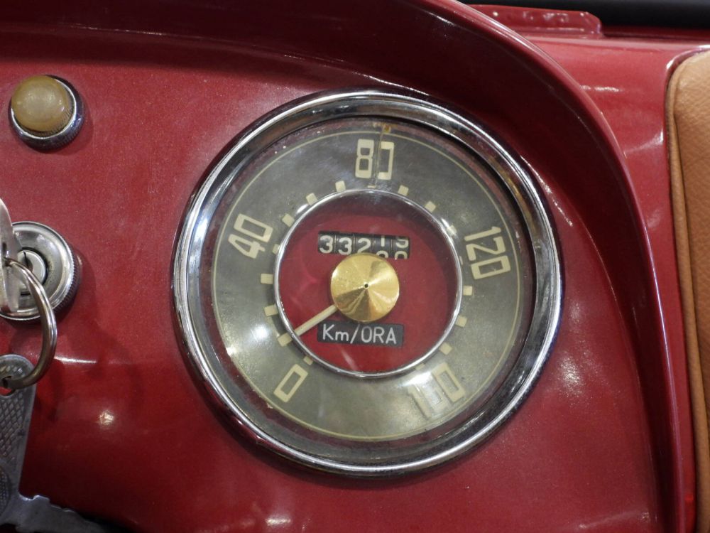 Sedili e pannelli in pelle beige e marrone, volante in legno ed alluminio con ghiera clacson cromata, Autoradio AM con antenna al parafango anteriore destro accessori originali dell’epoca, Coppe copricerchio dal disegno a raggi con gallettone a due alette, fregio sul cofano ”aeronautico”, Ripetitori laterali delle frecce ”siluri” ai parafanghi, Palpebre che sormontano i fari, Capotte in tela nera