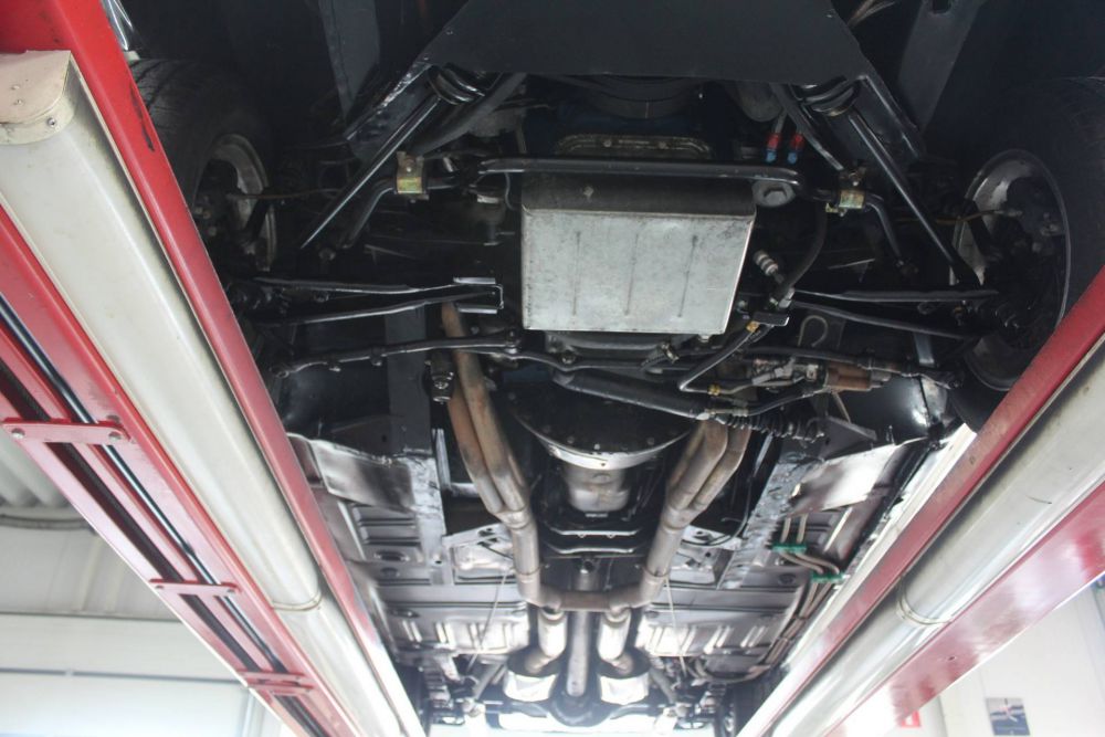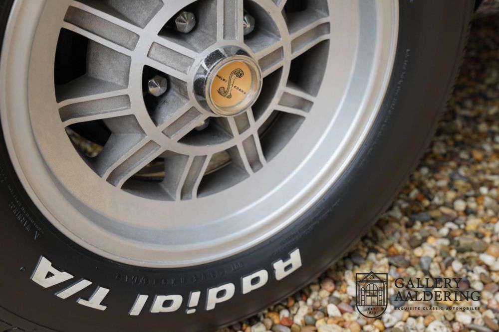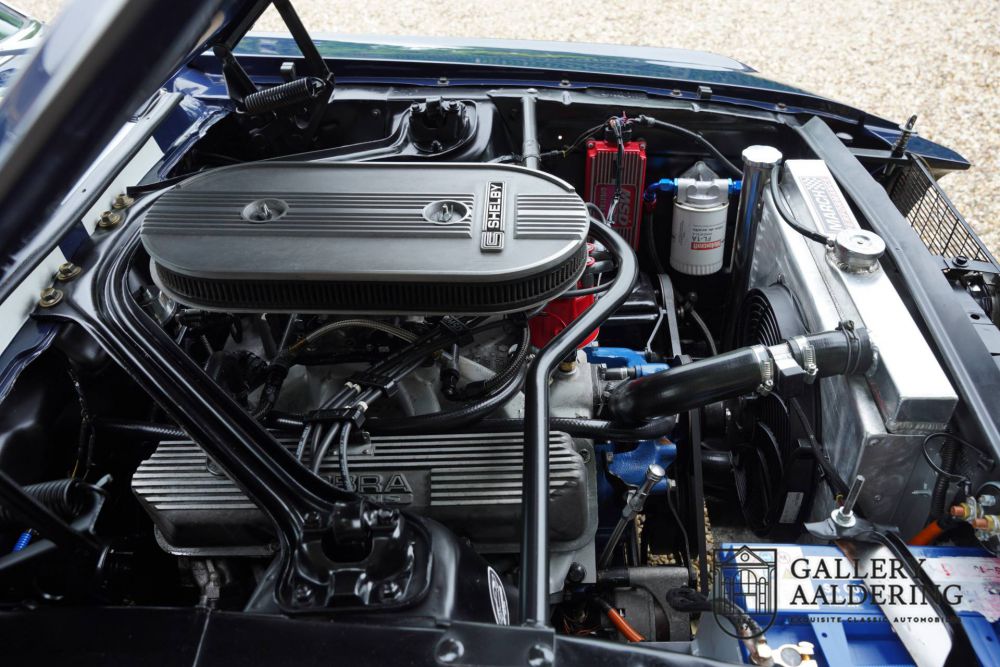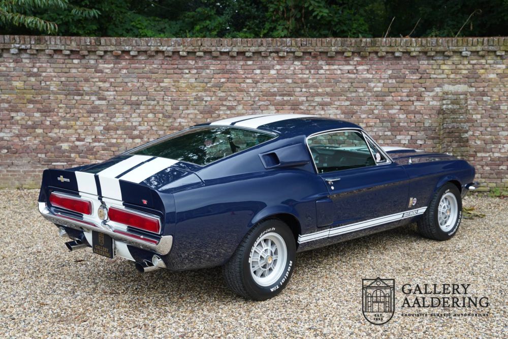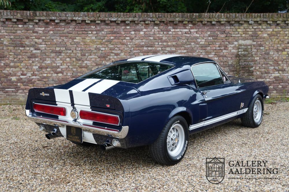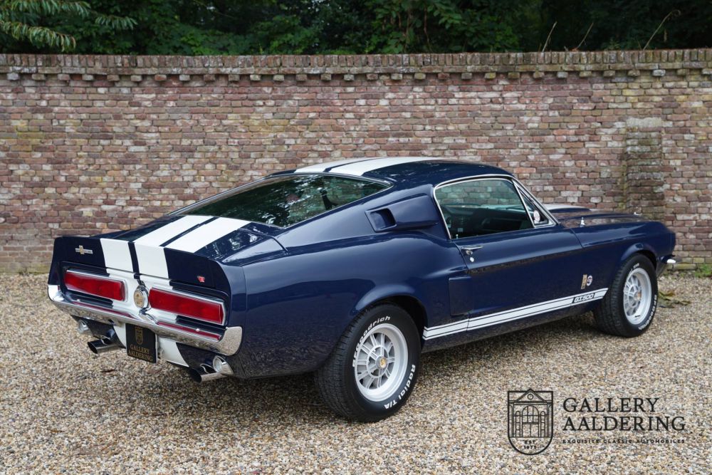 This GT underwent a complete restoration in the past, with a significant portion being fitted out with entirely new parts. The undercarriage was also fully restored and brought up to top condition. The restoration was done to replicate the appearance and interior of a Shelby GT500. This meant applying the characteristic white stripes on the exterior, which were coated with a clear layer along with the dark blue paint during the restoration. The wheels also stand out, as the GT wheels were replaced with 15 Shelby wheels, including Shelby logos.