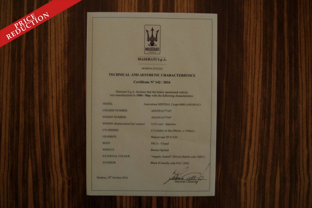 Our car is an original European model, which was restored and mechanically overhauled several years ago. With the help of the included Maserati Classiche certification, we are able to confirm this is a matching number specimen, including the matching colours as this Mistral left the factory in 1966.
