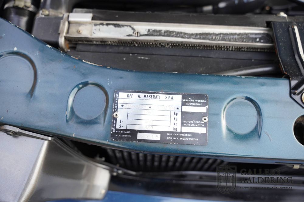 Moving inside we see the fine, original condition. The unmissable Maserati instrument panel with large central trident in between blue gauges being totally intact as is the rest of the dashboard, centre console and door cards. The seats look quite good, although the Alcantara is starting to show its age. No tears or damage but the drivers outer bolster is a little rough and has been discoloured by the drivers clothes. The seats are very comfortable and supportive, the lovely wooden steering wheel invites you to travel to the car’s country of birth, Italy. It must be an ultimate joy to travel in this Spyder whether with the fully functioning hood is up or down.