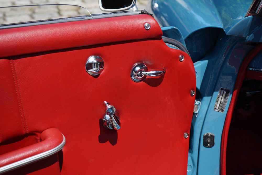 Das äußere Erscheinungsbild des Roadsters besticht durch seine wunderschöne, hellblaue Lackierung, die perfekt zu seinem roten Interieur passt.
