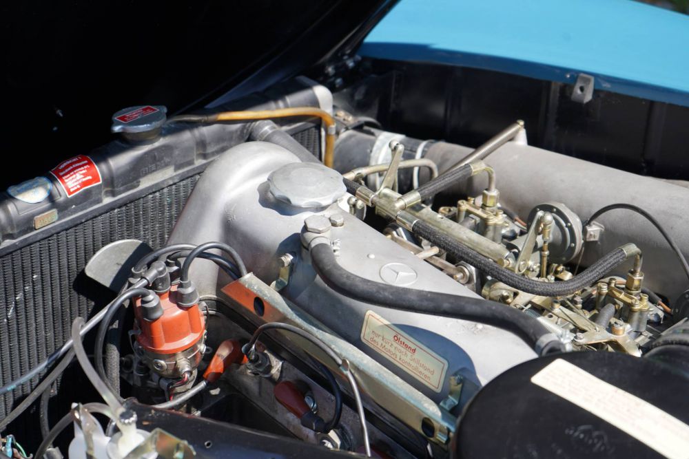 Angetrieben wird das Fahrzeug von einem kraftvollen 4 Zylinder Motor mit 1884 ccm Zylinderkapazität und einer Leistung von 105 PS. Damit erreicht der Mercedes 190 SL Roadster eine Höchstgeschwindigkeit von 173 km/h.