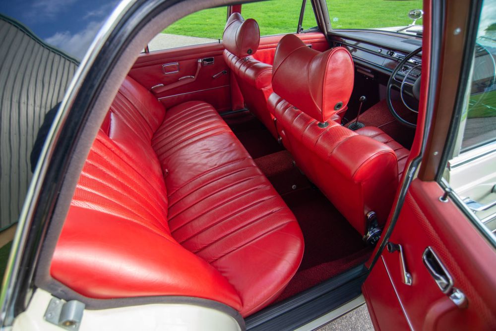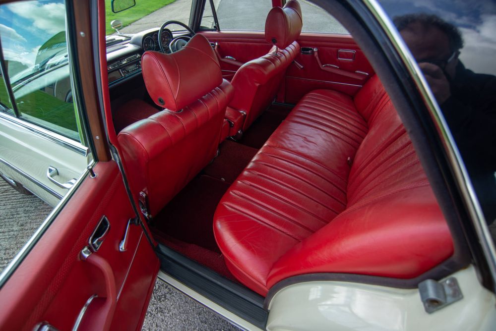 He special ordered two-tone paintwork – 040 black over Light Ivory. Inside it was optioned with real leather in red with headrests, unusual as most W108s made do with MB Tex vinyl.