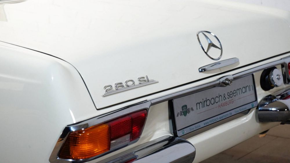 The Mercedes SL W 113 series, also known as the “Pagoda” because of the shape of its hardtop, replaced two previous SL models. Equipped with six cylinders, the Pagoda was in the middle of the outgoing 190 SL and the very sporty 300 SL in terms of performance. The new roadsters offered dignified and confident dynamics in a timelessly elegant and sporty look, paired with more comfort. A classic car, sporty, solid and back then mostly equipped with power steering and brake booster. This Mercedes 280 SL Pagoda, with its 170 hp, is the final expansion stage of the series and was designed by the factory to be even more comfortable. Delivered in 1969 with an additional automatic transmission, the convertible offers dignified and confident open-air enjoyment. A high-quality classic car in a beautiful color combination that you can get in and enjoy straight away.