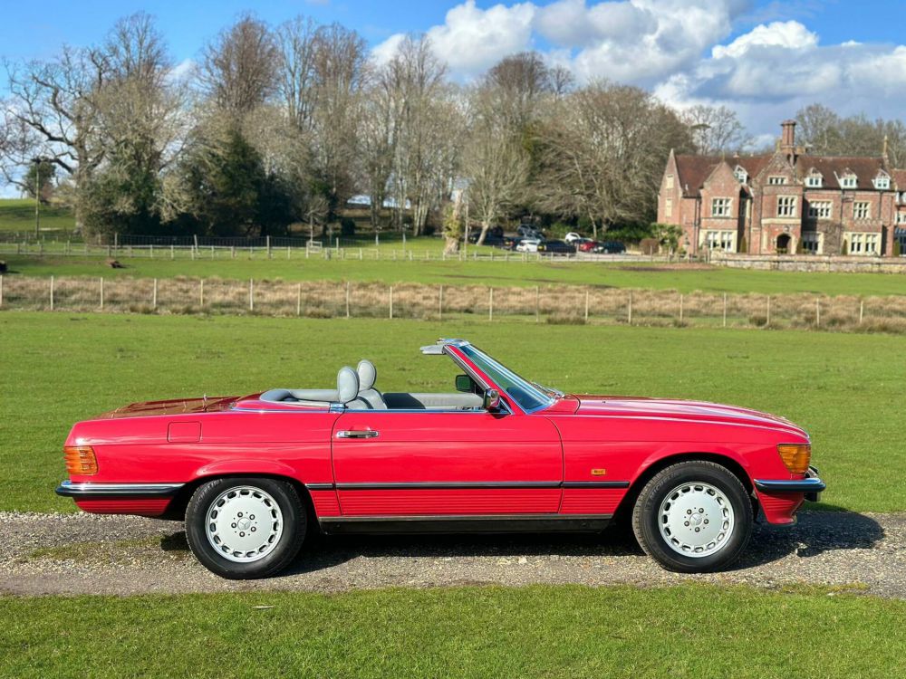 1988 Mercedes 300SL R107. Having only completed 35,690 miles from new, this car has just come out of a 33 year ownership with receipted work of roughly £13,500 since 2019 with less than 60-miles travelled since. It's finished in Signal Red and the paintwork is all original.