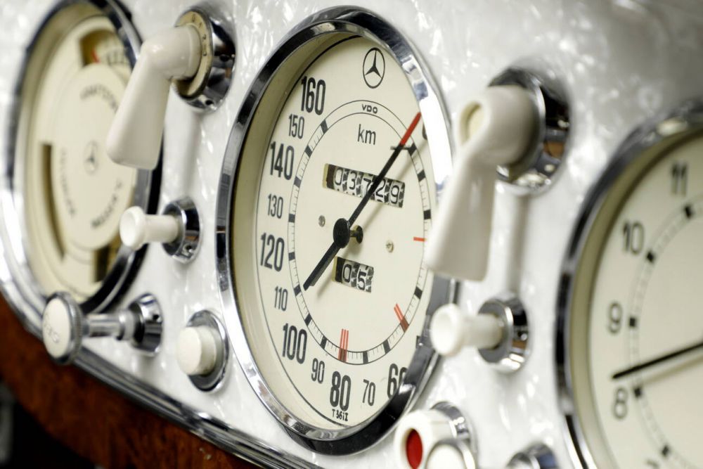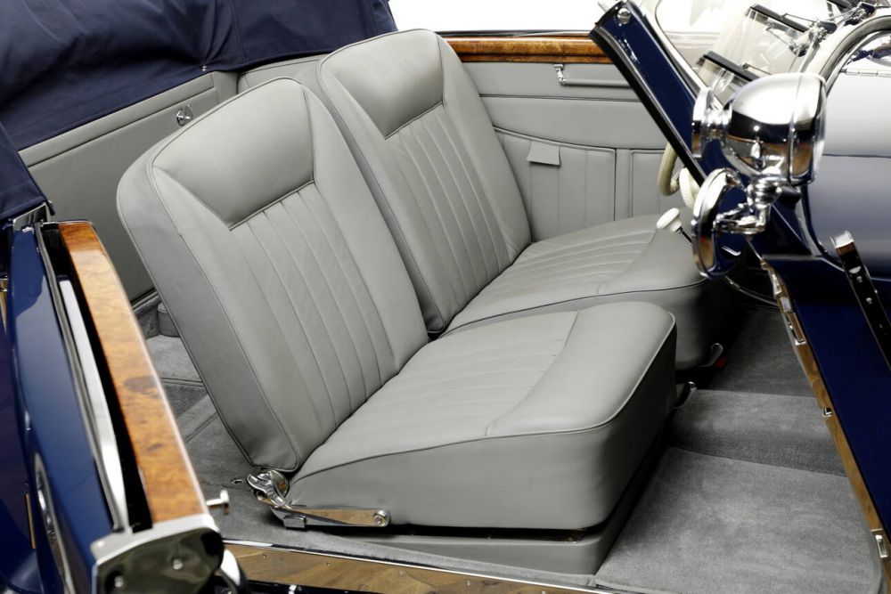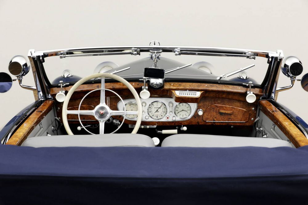 Dieses 1938 ausgelieferte Mercedes Benz 320 Cabriolet A ist eines von nur 30 Exemplaren seiner Art. Zudem handelt es sich hier um die modifizierte Motorisierung mit 3,4 Liter Hubraum (W 142 IV, ohne dass das Modell als Typ 340 benannt wurde), die zudem mit einem Viergang-Getriebe mit Schnellgang ausgestattet ist. Das Fahrzeug befindet sich seit 2019 beim jetzigen Besitzer in Deutschland, der das Fahrzeug in restauriertem Top-Zustand erworben hatte. Die Karosserie und andere Komponenten wurden über einen längeren Zeitraum beim vorherigen Eigentümer umfassend restauriert. Das Leder-Interieur wurde vollständig erneuert und die Hölzer des Innenraums überarbeitet. Der 6-Zylinder-Reihenmotor wurde wie das Fahrwerk und die übrige Technik/Elektrik überholt beziehungsweise erneuert. Diese Arbeiten wurden im Jahr 2018 abgeschlossen und seitdem befindet sich der Wagen in seinem erstklassigem Zustand. Die zweifarbige Lackierung in edlen Dunkelblautönen unterstreicht das elegante Design des Wagens, damit harmoniert perfekt das zurückhaltende graue Lederinterieur. Ein besonderes Detail ist der modelltypische quer zur Fahrtrichtung eingebaute Sitz für einen dritten Passagier hinter den beiden Vordersitzen. Dieses sehr seltene Mercedes 320 Cabriolet A besticht durch seinen herausragenden Gesamteindruck. Die sportlich-elegante Linienführung und die zahlreichen liebevollen Details sorgen dafür, dass dieser Wagen den großen 8-Zylinder-Mercedes-Kompressor-Modellen aus der gleichen Epoche in nichts nachsteht.