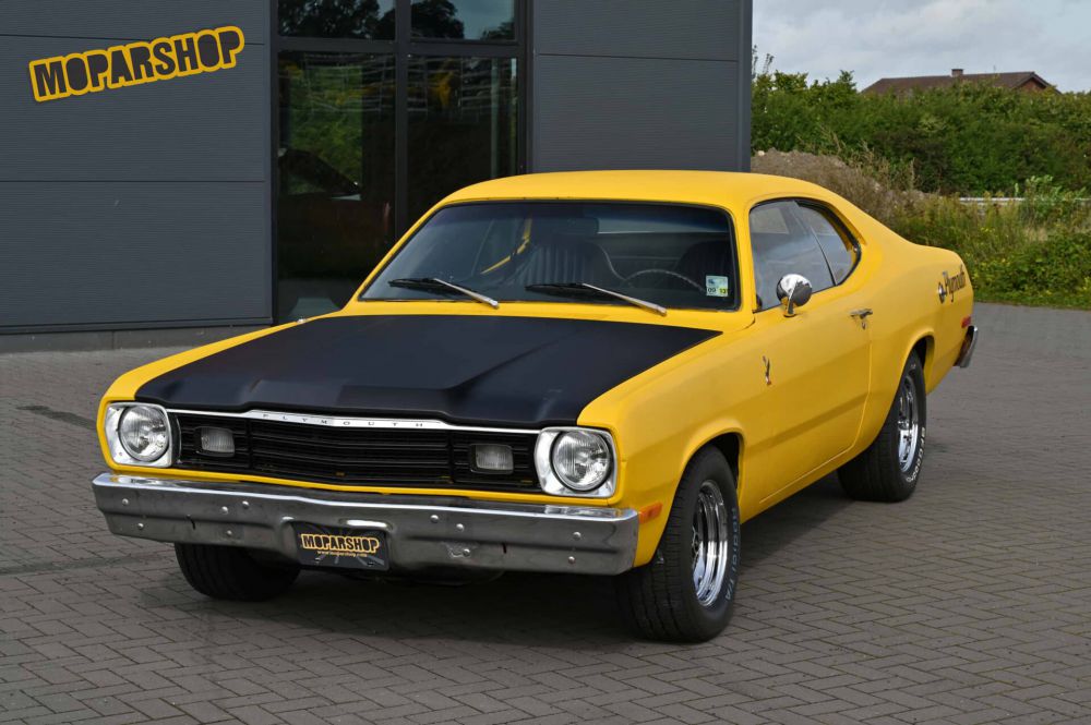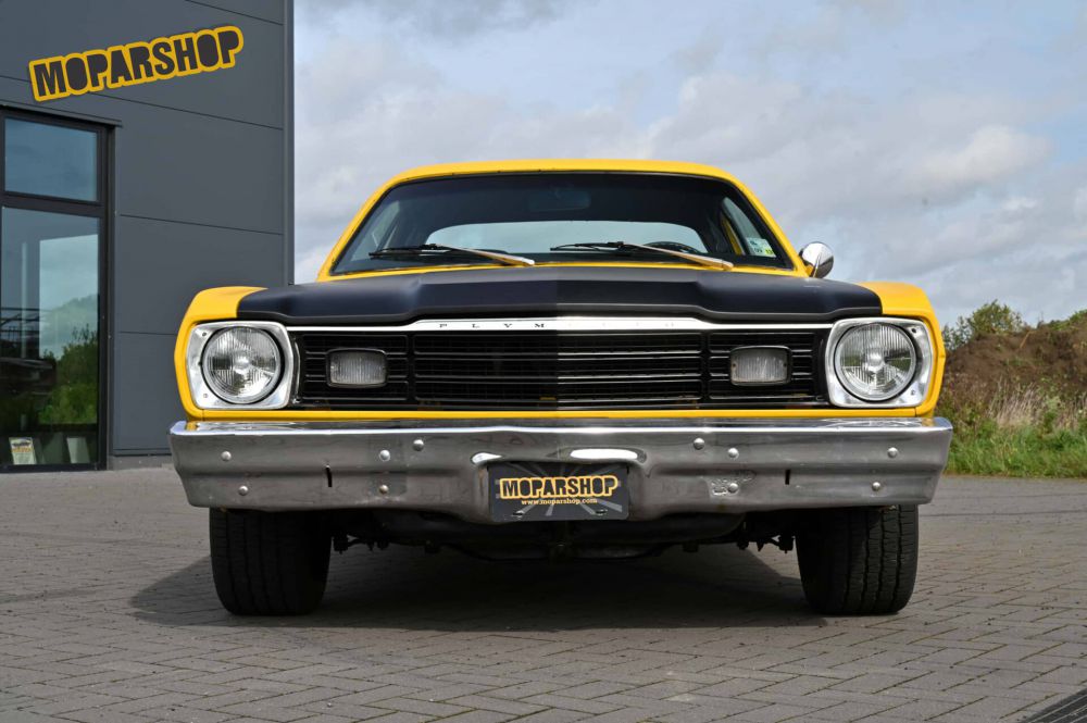 Here we offer a small, sporty 1973 Plymouth Duster for sale. It is a genuine H-code (340cui) car, now fitted with a good & clean running small block 318cui engine. On request we can also install a 340cui engine, you can find our current engine offers here in our online store www.moparshop.com. Its silk matt yellow exterior paintwork is an absolute eye-catcher. This A-Body is a Mopar that is small enough to go anywhere, but big enough for five instead of four passengers. The robust unibody construction ensures solid comfort and it impresses with its great roadworthy handling. This muscle car was last at home in Holland. The previous owners invested a lot, but nobody achieved the goal of turning it into a functioning fun car. We took this top bodywork and the good basis, solved problems that were insurmountable for others and optimized the car. As a result, it has gained in functionality and reliability is guaranteed. Fun and user-friendliness are also guaranteed. In addition, the Duster has become something very tasteful in our eyes, not least because of its unique paintwork. We had a full German TÜV inspection and the car came with a certificate to obtain an H license plate. So just register and drive off. So if you like the car and want a not too big, but classically agile and affordable Mopar with a unique look, then make an appointment for a viewing and see how the car handles in real life. Here are a few key technical specifications of the car: