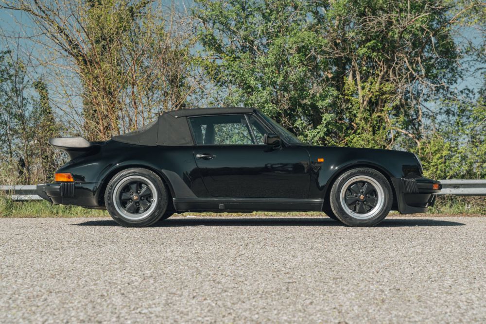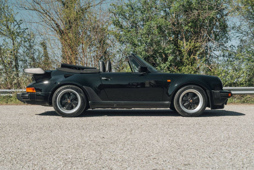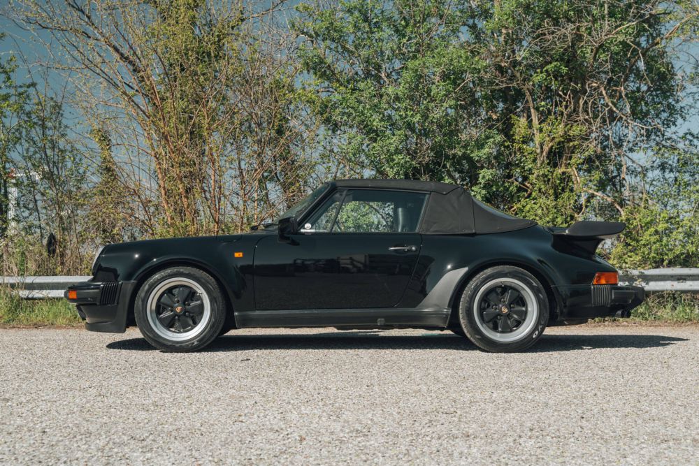 This 1988 Porsche 930 Cabriolet was delivered new on the 30th of May 1988 to its first owner in Germany. Finished in black over black leather with a black fabric top and black-center Fuchs alloy wheels, this 930 was ordered in a stunning specification that would look great in any garage. After staying with its first owner in Germany for a few years, the car was sold to Italy, where it has lived ever since. The consignor is the third owner of the car, and it has been in his possession since 1999 when he purchased it with roughly 50,000 km on the odometer. Now, it shows just under 129,800 km and benefits from a thorough recent servicing to the tune of nearly €30,000. The black paint on the car has been refreshed, but there is no accident damage in the car’s history, and given the car’s historic status, it is eligible to obtain the original Italian license plates it wore upon entry to the country more than 30 years ago.