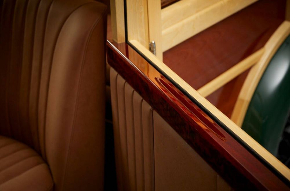 The bodywork has been completely rebuilt and flawlessly finished in British Racing Green, with a perfect gloss that highlights the intricate wooden panels—each side mirroring the other for a seamless look.