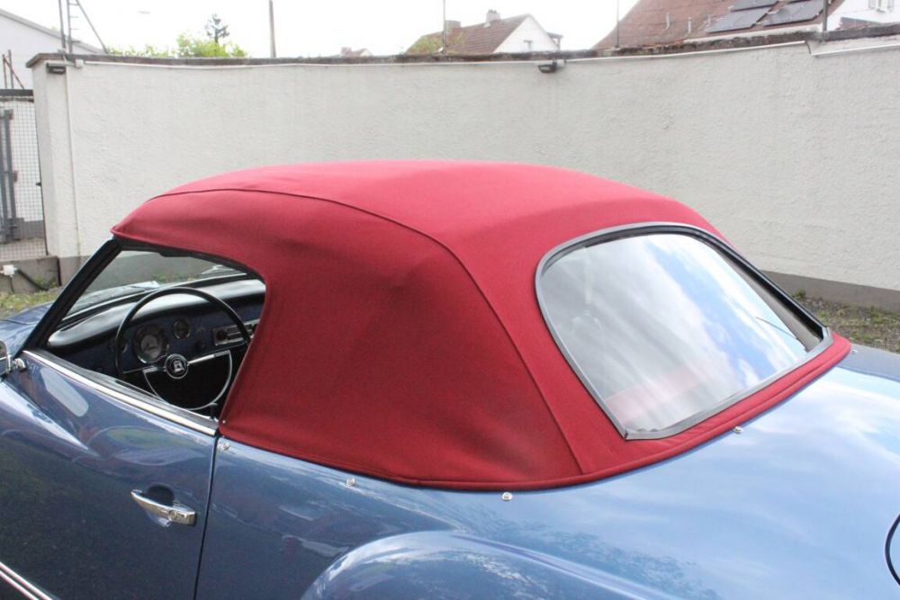 Die Restaurierung ist äußerst liebevoll und sachkundig in geschmackvoller Farbkombination geminiblau met.mit rotem Interieur und rotem Verdeck ausgeführt. Flächigkeiten, Lackqualität und Spaltmaße der Karosserie